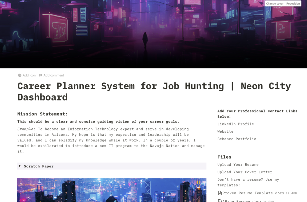 I created a job hunting and career development dashboard for myself. My notes for job applications, interviews, and even career journal prompts are all in one place along with everything else I need to succeed.